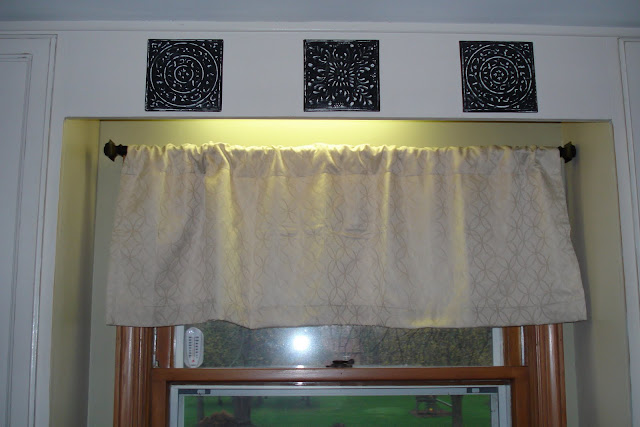 On a trip to Salvation Army, I spied this awesome curtain for 3 bucks. The pattern matched the backsplash so well, so I snatched it up.